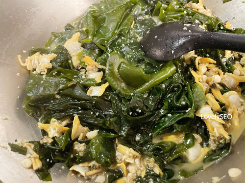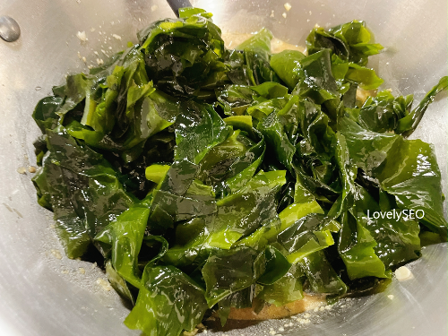 불려둔 미역을 전부 넣고 3분 정도 같이 볶으며