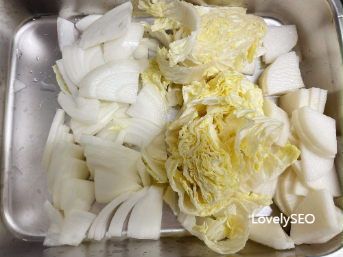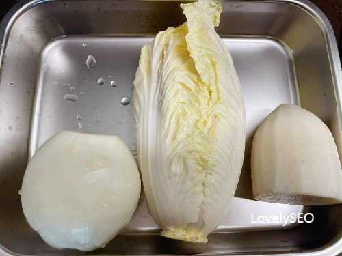 양파와 알배추, 무는 씻어서 준비하여 주세요.