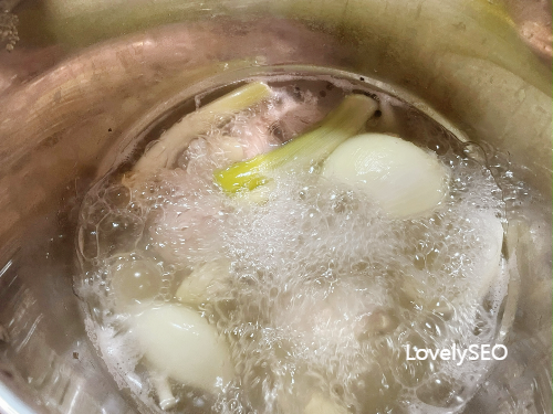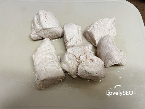 물이 끓어오르면 돼지고기 안심을 넣고 삶아 줍니다.