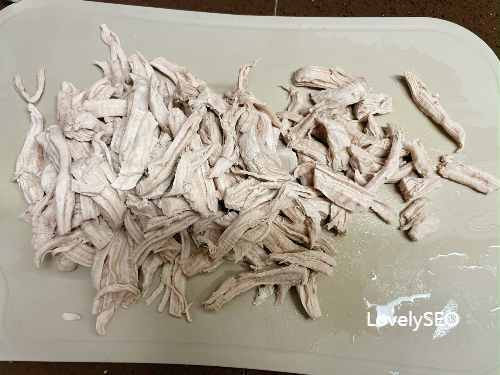 고기를 찢을 때 살짝 뜨거워서 두껍게 찢었더니