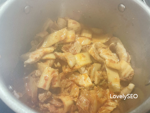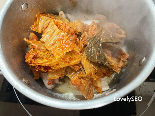 삼겹살이 어느 정도 익으면 김치를 넣고 같이 볶아 주세요.