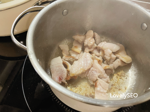 삼겹살이 냄비에 쉽게 달라붙으니 기름을 살짝 두르는 걸 추천해요.