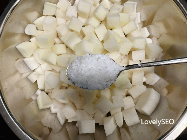 깍두기에 적당한 간을 넣어 주는 작업이에요.