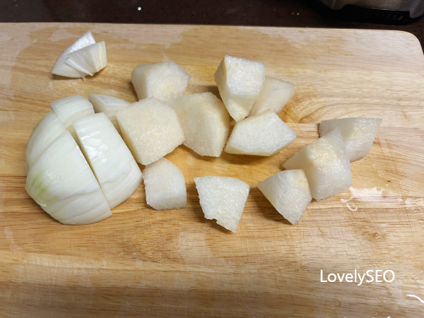 적당한 크기로 모두 깍둑썰기하여 주세요.