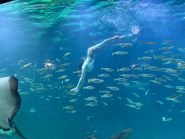 대형 수조에 물고기와 가오리 상어들이 수영하고 있어요.