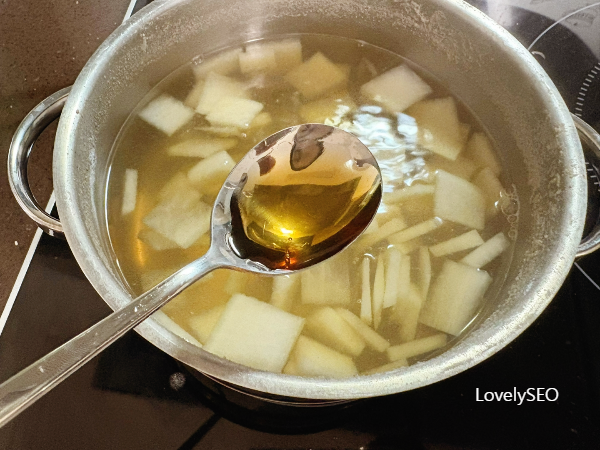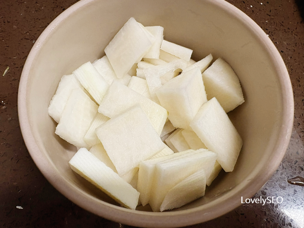 무는 잘 익을 수 있도록 나박 썰기로 잘라 주었답니다.
