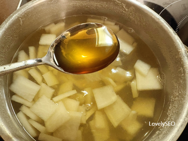 물이 끓어오를 동안 무를 잘라 줬어요.
