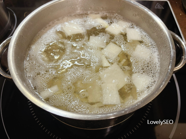 물이 끓어오르면 무를 먼저 넣고 끓여줘요.