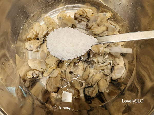 굴이 잠기도록 물을 붓고 굵은소금 1T를 넣어