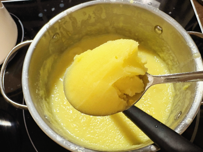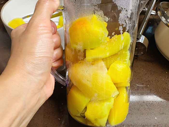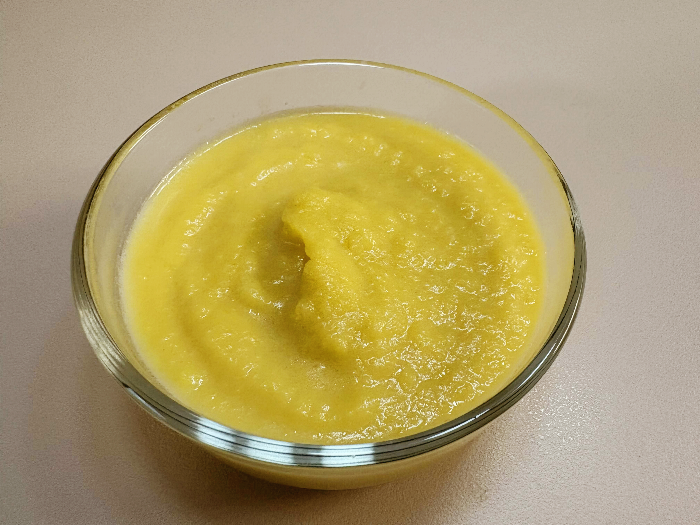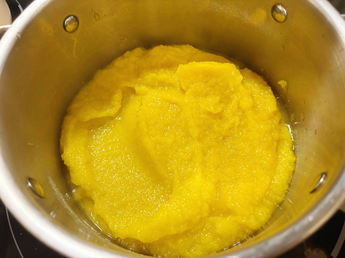 잘 갈아진 늙은 호박을 냄비에 부어 주세요.