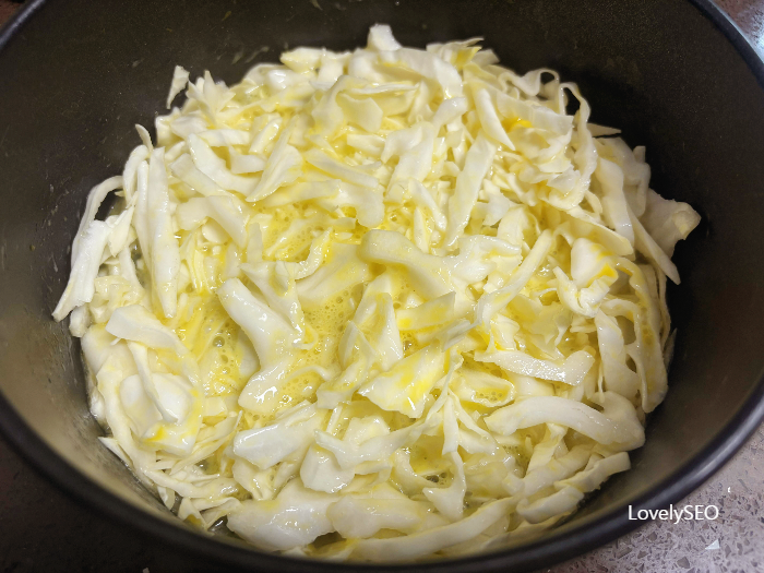 대충 풀어서 양배추와 계란을 섞어 주세요.