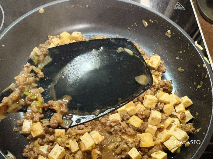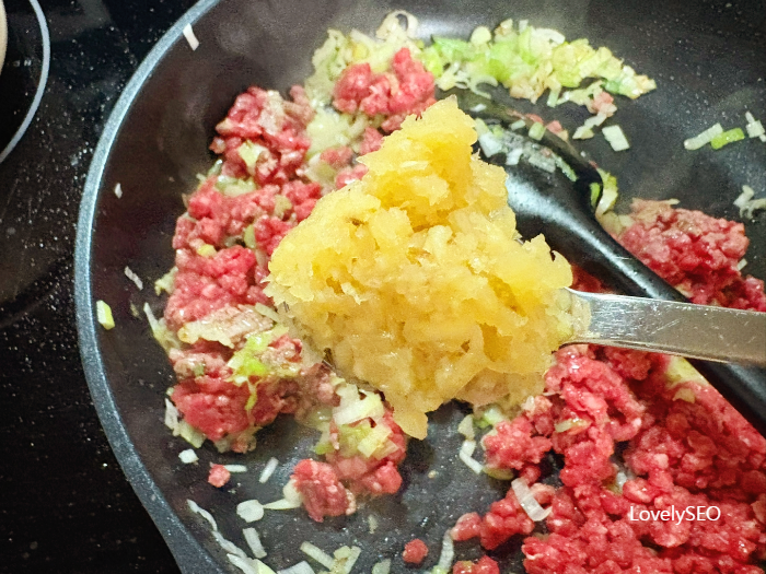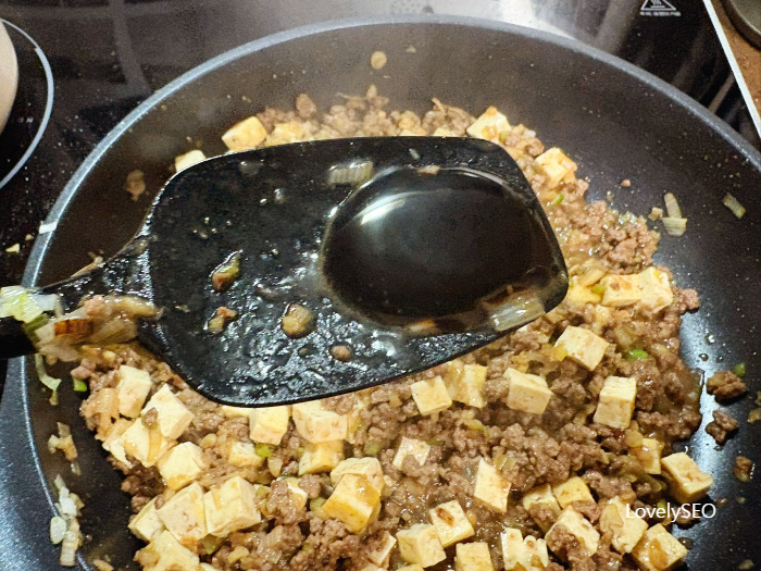 그리고 소고기 다짐육을 전부 넣어 볶아 줍니다.