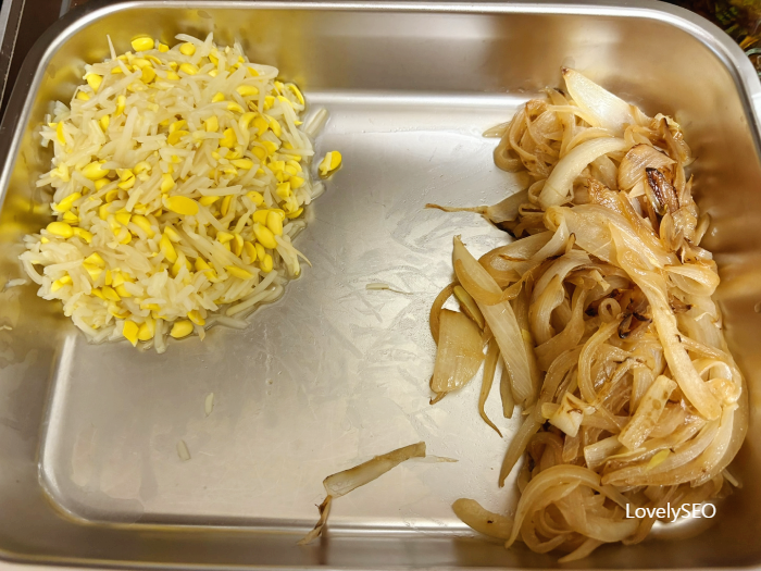볶은 양파와 콩나물을 넣어 주세요.
