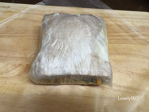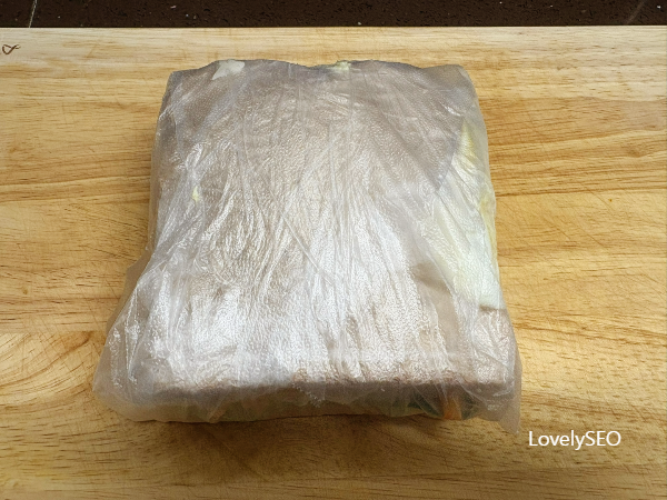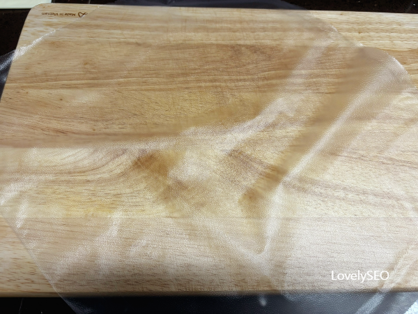 도마에 글래드매직랩을 마름모 모양으로 깔아 주세요.