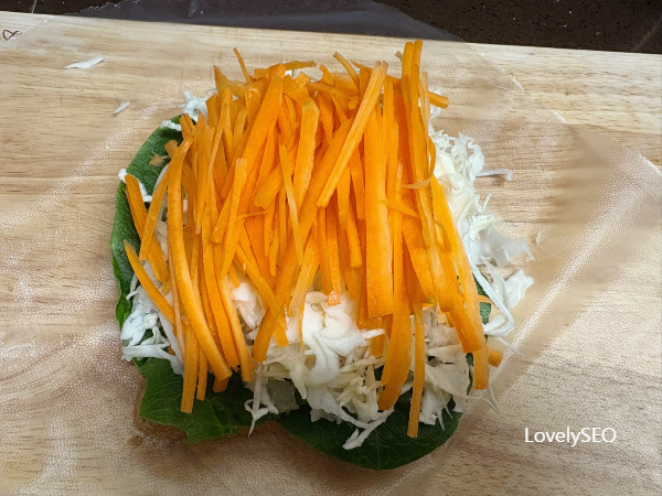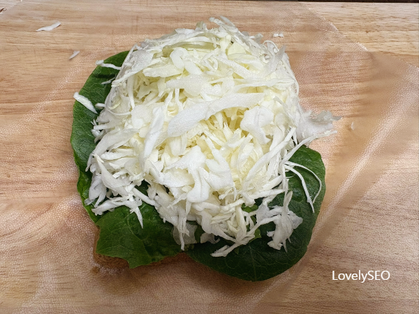 얇게 채 썬 양배추를 그 위에 올려 줍니다.