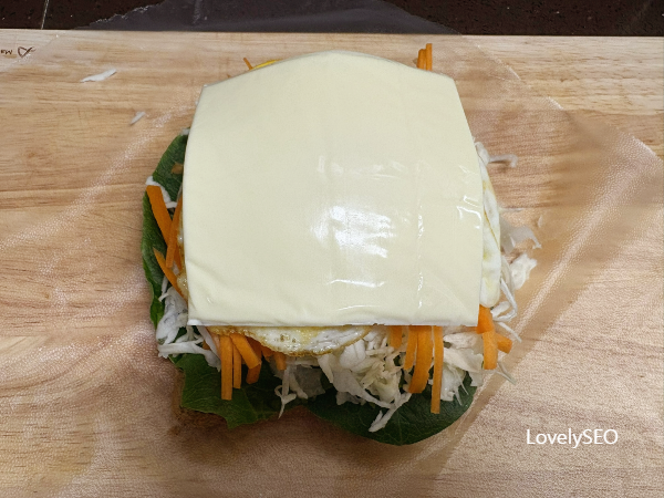 그 위에 슬라이드 치즈 1장을 얹어 주세요.