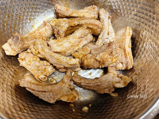 그리고 양념한 등갈비를 넣어 줍니다.