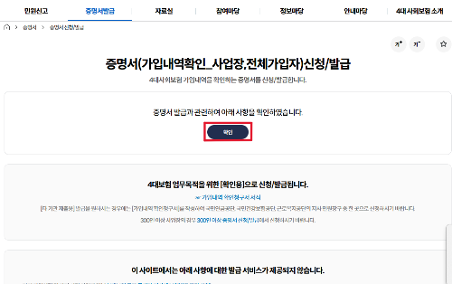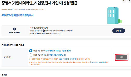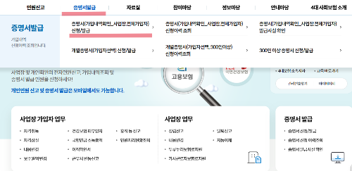 거기서 가장 처음에 있는 증명서(가입내역확인_사업장, 전체가입자) 신청/발급을 클릭합니다.