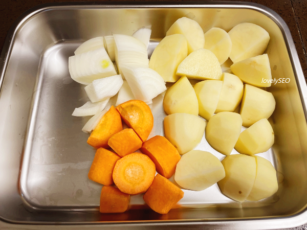 돼지갈비찜이 끓는 동안 감자와 당근, 양파는 적당한 크기로 잘라서 준비합니다.