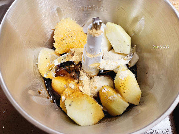 들어가는 양념을 모두 같이 넣고 다지기로 곱게 갈아 줍니다.