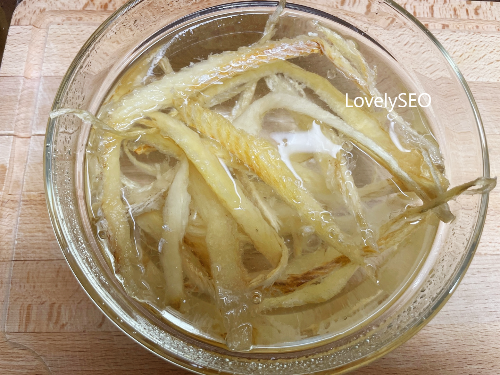 볼에 황태채를 넣고 물을 부어 줍니다.