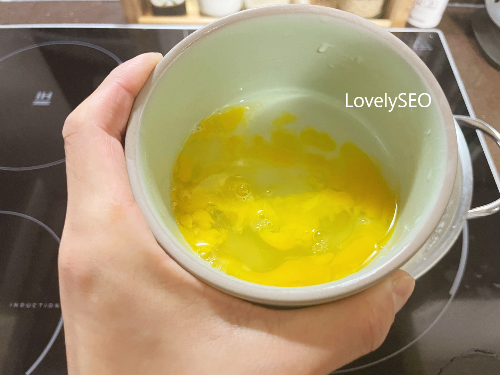 계란 1개를 그릇에 풀고 냄비에 넣어 줍니다.