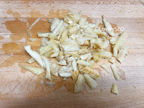 잘 불려진 황태채는 잘게 잘라 줍니다.