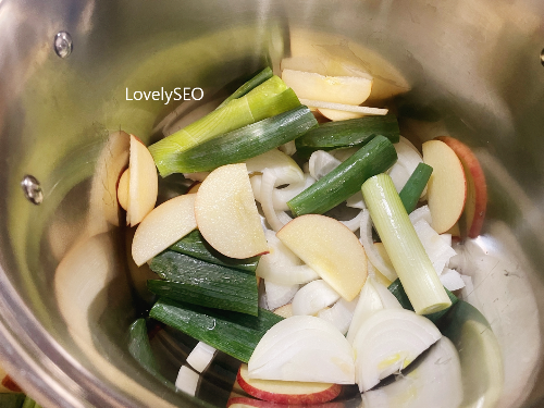 사과, 양파, 대파를 준비한 양의 반만 먼저 바닥에 펼쳐 줍니다.