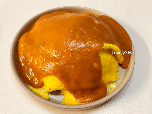 그 위에 소스를 가득 얹어주면 완성입니다.