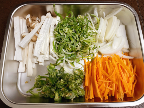양파, 당근, 새송이 버섯은 채 썰어 준비하고 청양고추도 송송 썰어주세요.