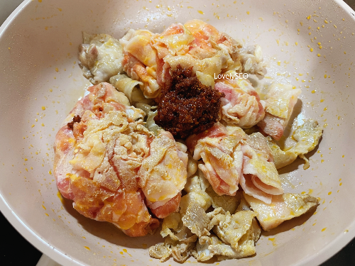 프라이팬에 대패삼겹살을 넣고 먼저 구워주다가 양념장을 1/2 넣고