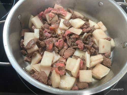 소고기를 어느 정도 볶다가 나박 썰기 해 놓은 무도 같이 넣고 볶아 주세요.