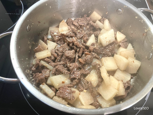 꼭! 소고기를 완전히 익히고 나서 물을 추가하여 주세요.)