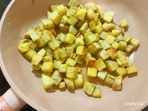 고구마를 다시 프라이팬에 넣고 부서지지 않게 잘 섞어 주세요.